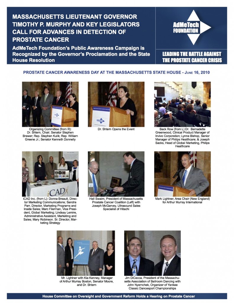 On June 16, 2010, AdMeTech Foundation coordinated the second annual Prostate Cancer Awareness Day at the State House in Boston, Massachusetts. The event was held between 10 am and 2 pm, in the Massachusetts State House’s Nurses’ Hall and featured keynote speaker Lieutenant Governor Timothy P. Murray.