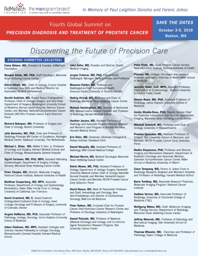 Forth Global Summit on Precision Diagnosis and Treatment of Prostate Cancer. View Selected steering committee for 2019.