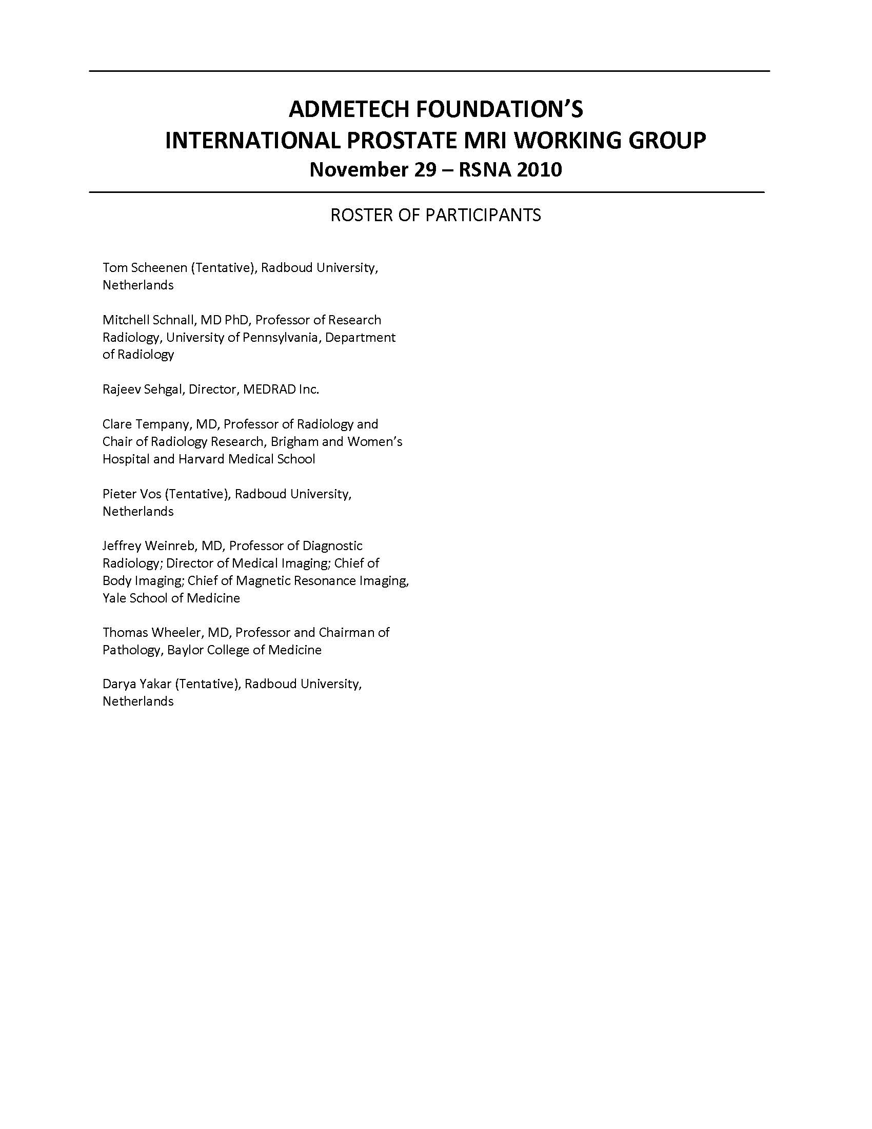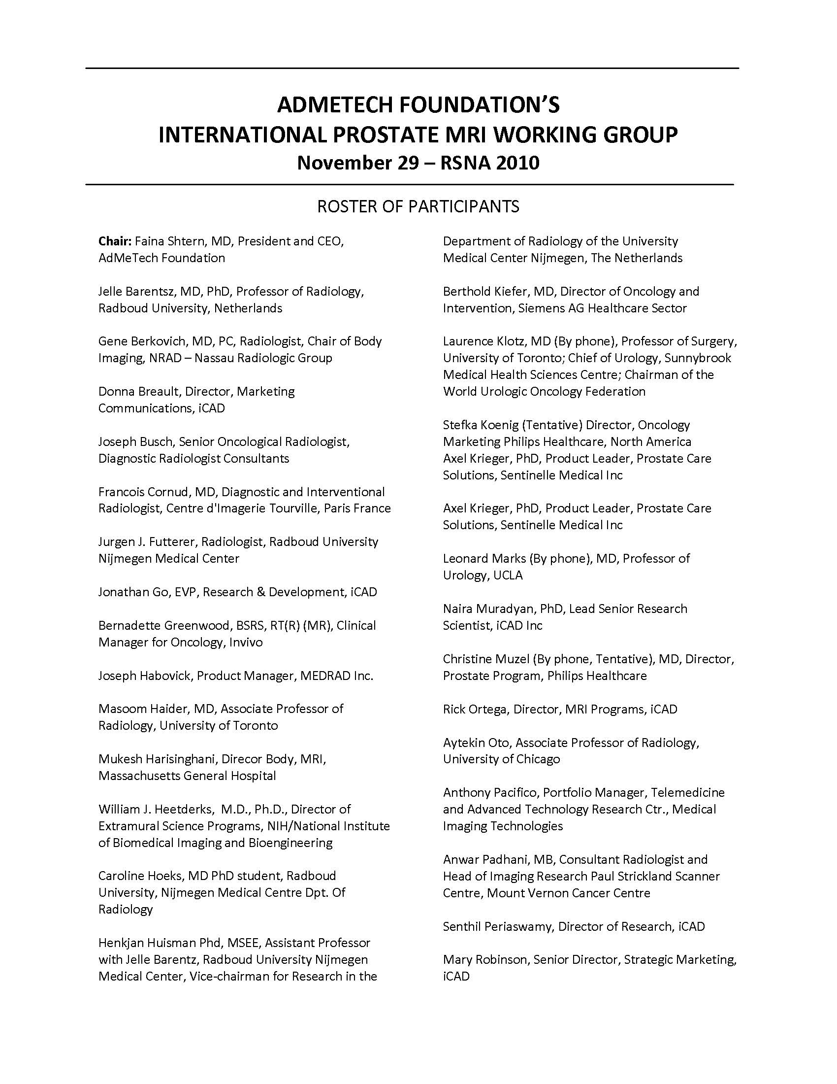 International Prostate MRI Working Group Faculty Roster, November 2010