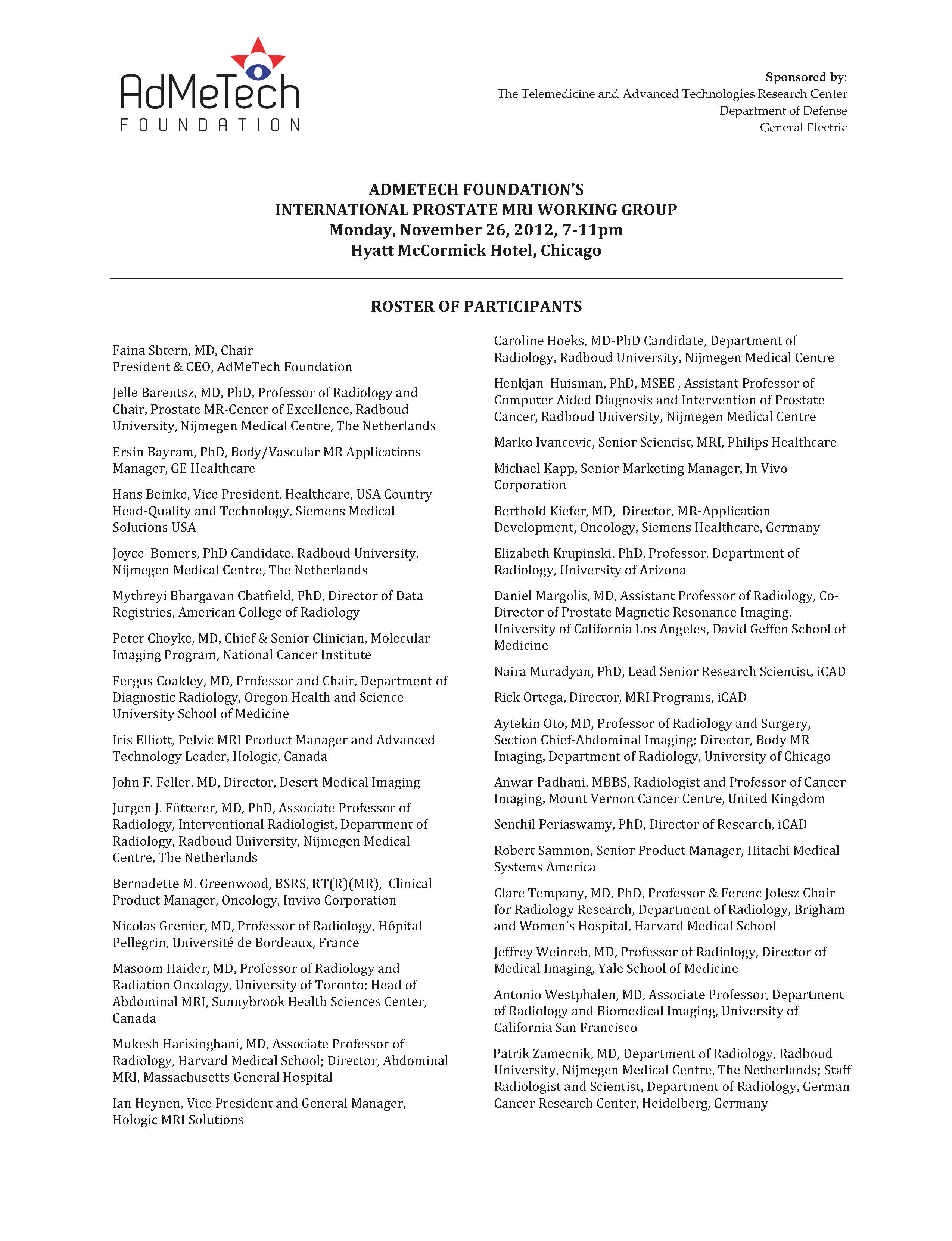 International Prostate MRI Working Group Faculty Roster, November 2012