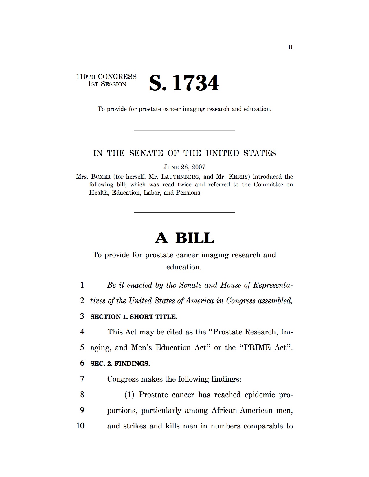 June 2007: The AdMeTech-driven prostate research Imaging & Men’s Health Education (Prime) Act (S. 1734) is introduced in US senate by Sen. Barbara Boxer (D-CA) to allocate $650 million over five years for research and education in diagnostics: $ 500 million for imaging technologies and 100 million for in vitro diagnostics. Co- Sponsors include senators John Kerry (D-MA) and Frank Lautenberg (D-NJ).